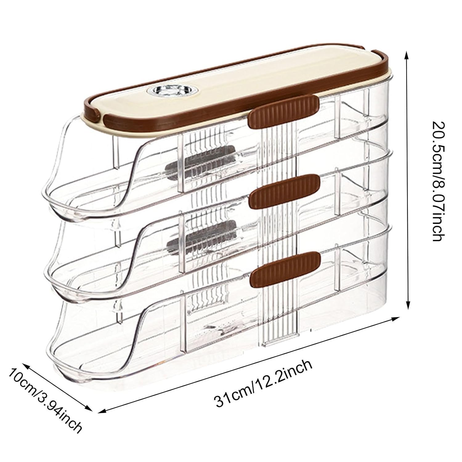 This streamlined 3-layer egg dispenser offers efficient, space-saving storage with a single row design that holds approximately 18–42 eggs- depending on size of eggs. Its automatic roll-down functionality, ideal tilt angle, and built-in timing feature help maintain freshness, prevent sticking, and protect eggs from damage. Designed for convenience, the dispenser allows easy loading and removal while freeing valuable refrigerator or countertop space. Suitable for chicken eggs, duck eggs, and more, it provides organized, accessible storage for your fridge, pantry, or any kitchen area.