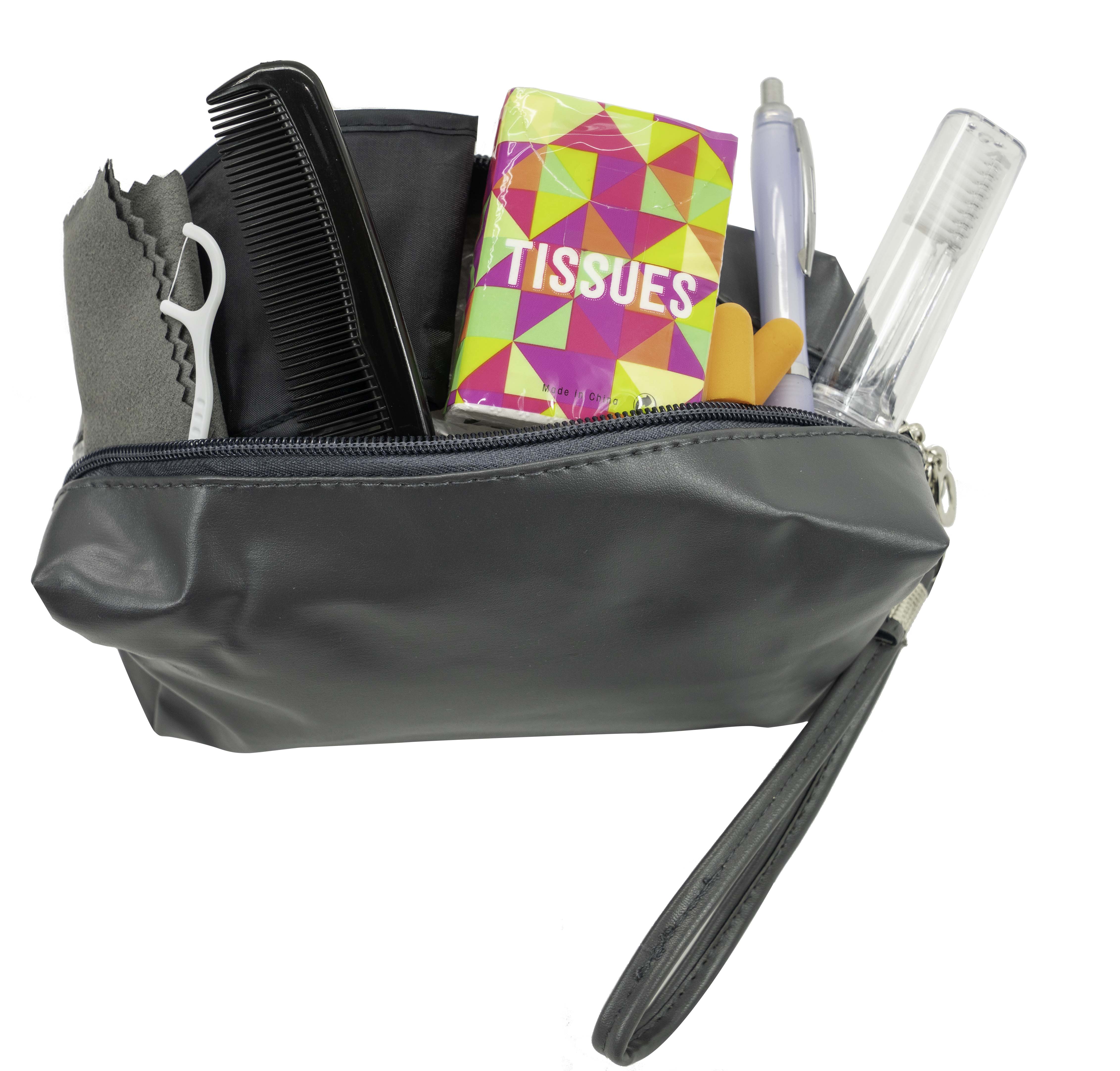 Includes: toiletry bag, comb, toothbrush, floss picks, tissue pack, sleeping mask, ear plugs, microfiber cloth, pen.