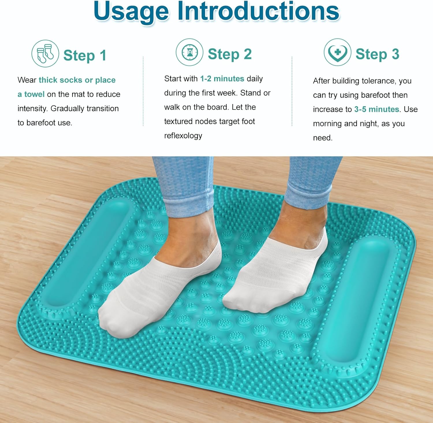 • Beginner-Friendly, Ease into It: The acupressure foot mat measures 20.1 x 17 inches, providing ample space for your feet. Begin with socks for 1-2 minutes. As your tolerance increases, switch to barefoot use and gradually work up to 3-5 minutes. It's good for pairing with massage balls to boost circulation or unwind fascia pre-sleep.