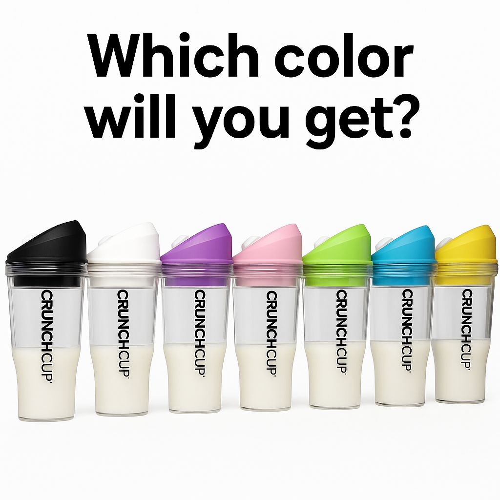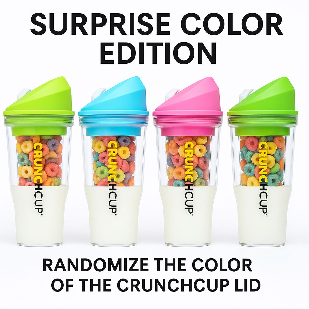 • Surprise element: CrunchCup lids come in random fun colors (pink, blue, green, yellow, purple, black, white).