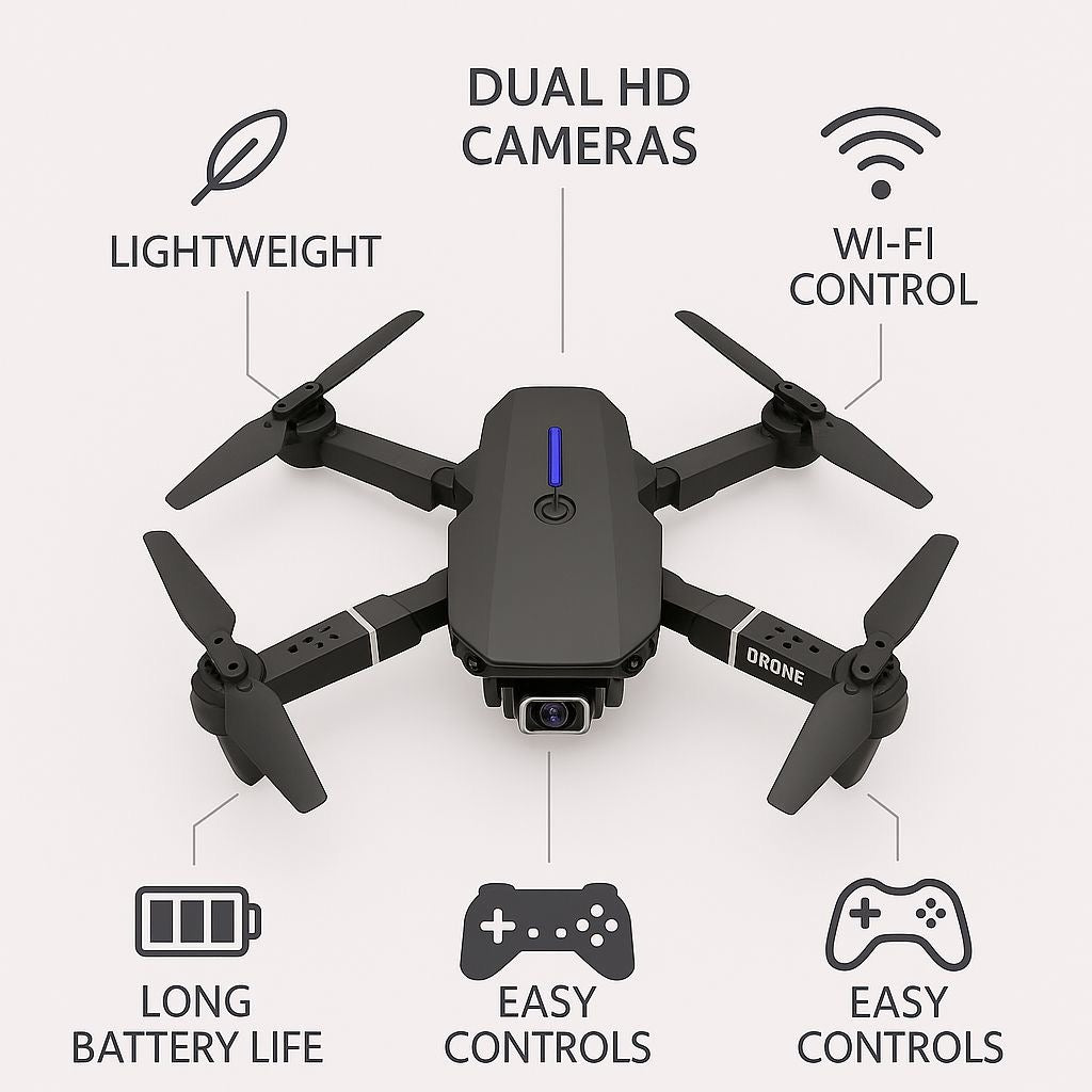 Experience effortless flying with the Explorer Pro Dual Camera Drone, engineered for everyone—from curious beginners to creative explorers. Its foldable lightweight design makes it easy to carry anywhere, while dual HD cameras capture stunning wide-angle shots from every angle. With Wi-Fi control, extended battery life, and easy-to-use remote functions, this drone delivers an unbeatable combination of portability and performance.