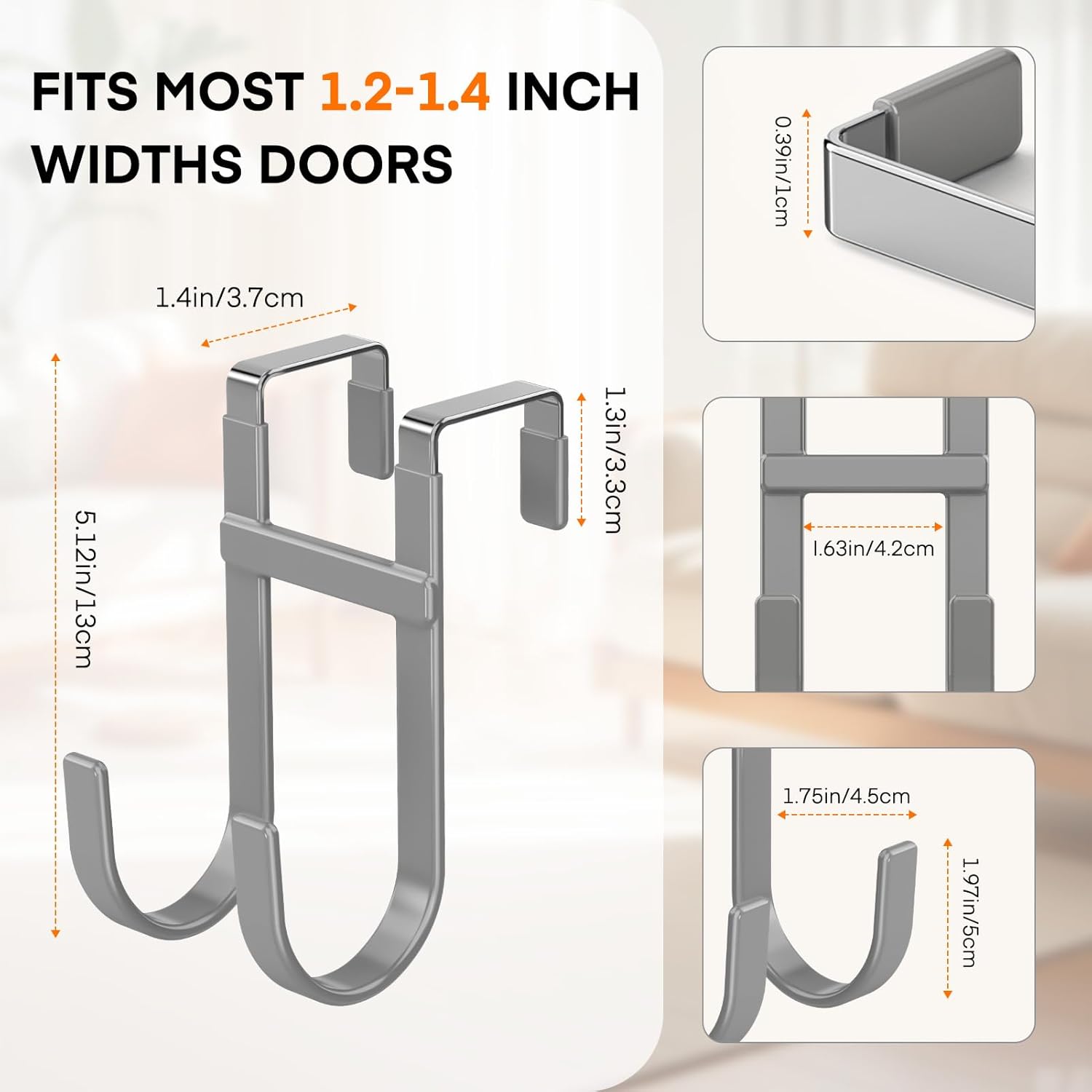 • Size: This over the door hanger hooks length 5.12 inch, groove width 1.4 inch, fit most of doors which widths range of 1.2-1.4 inches. Please measure your door before purchasing