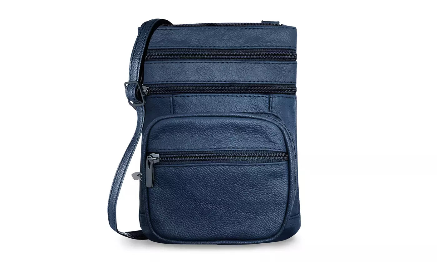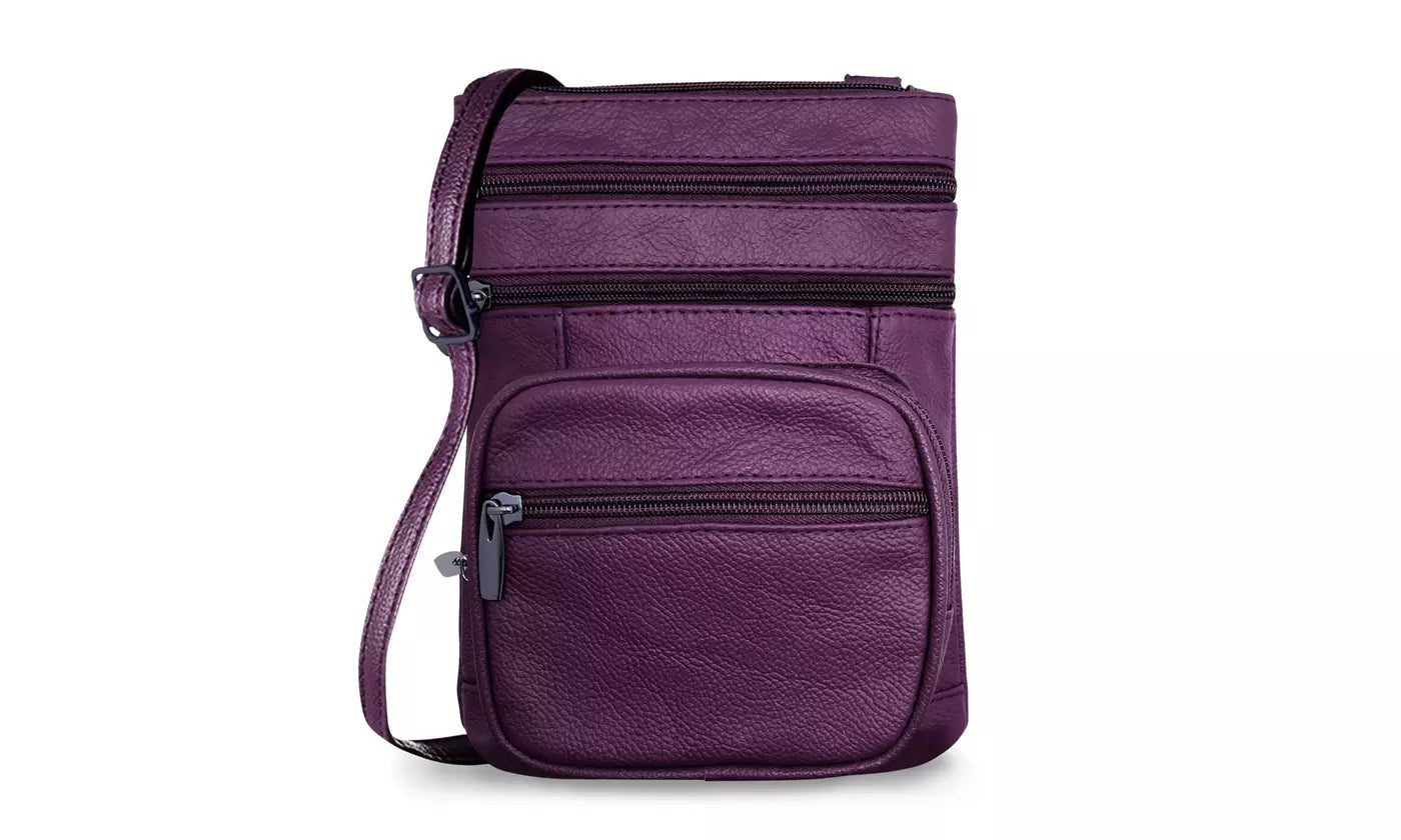 This crossbody will be your go-to bag for all occasions. Made of genuine leather this bag features a zipper front compartment, 2 zippers across the front of the bag, a top zipper for full bag access, and a back zippered pocket.