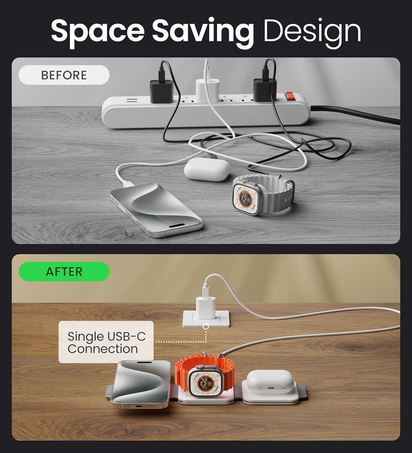 • Innovative Foldable Design: The sleek, accordion-style fold maximizes space and portability. At just 1.2” thick when folded and 0.4” when opened, this compact 3-in-1 multi-charging station for Apple devices is travel-friendly, perfect for charging anywhere, anytime.