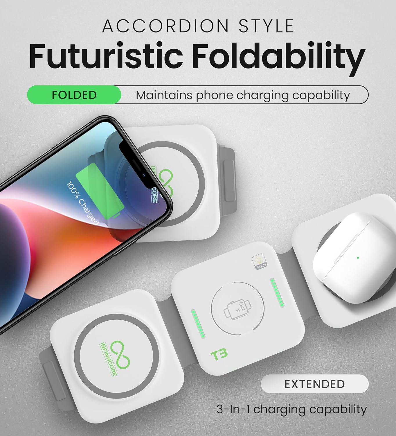 InfinaCore 3-in-1 Foldable MagSafe Wireless Charger for iPhone, Apple Watch & AirPods
