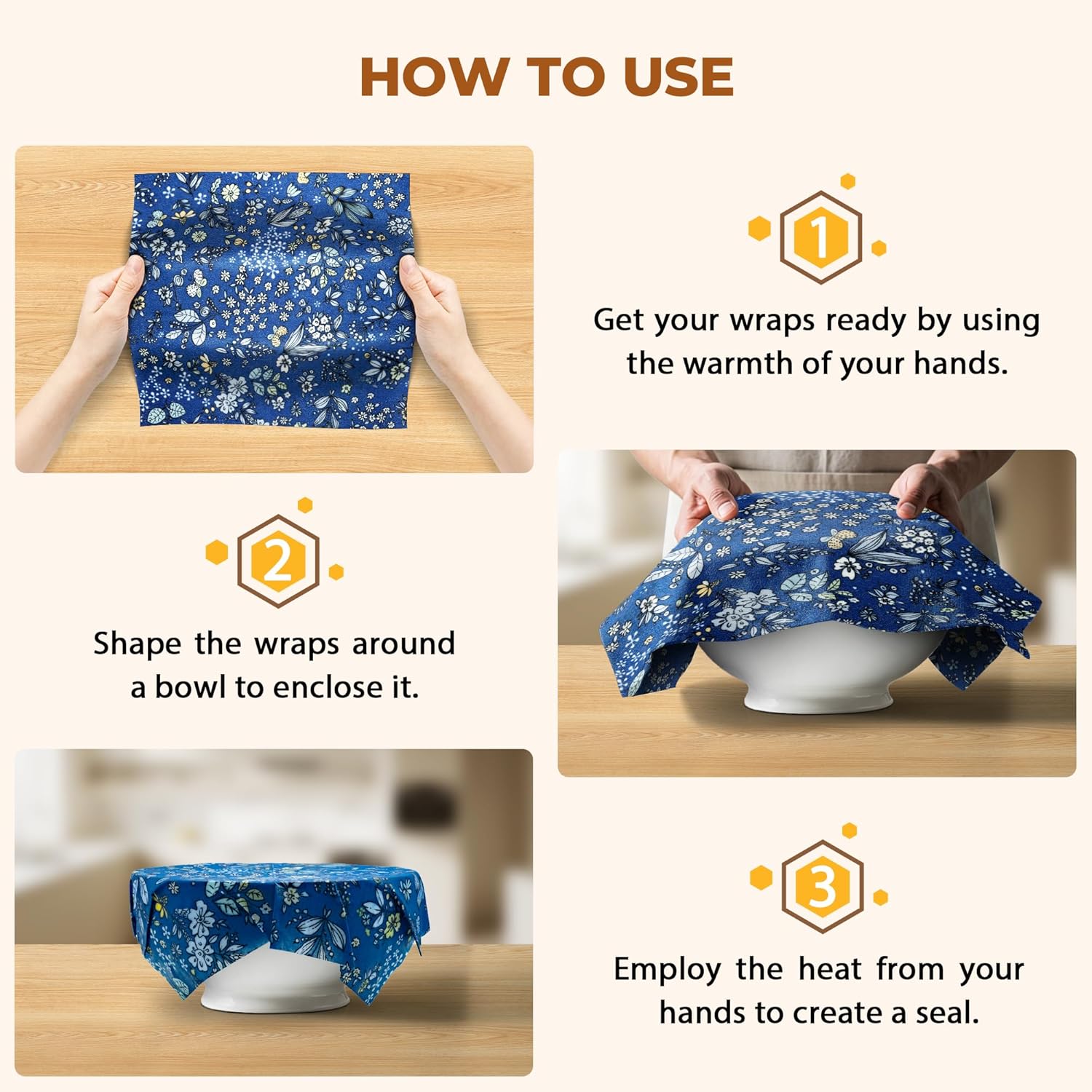 Made from 100% natural materials — beeswax, pine resin, jojoba oil, and organic cotton. Pine resin enhances stickiness, jojoba oil keeps wraps soft and pliable, while the breathable cotton fabric provides a sturdy base for lasting freshness.
