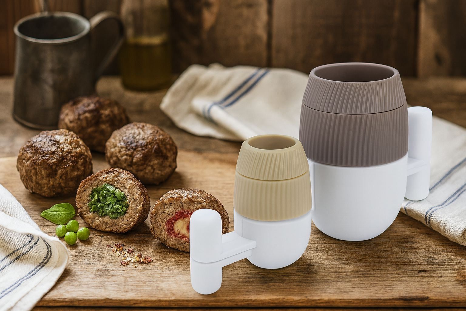 Make gourmet stuffed meatballs in minutes! This 2-in-1 mold set creates perfectly shaped small (1.5”) and large (2.3”) meatballs, evenly textured and ready for your favorite fillings—cheese, veggies, sauces, and more. Ideal for meatballs, stuffed cakes, pasta, and dumplings. Quick, easy, and fun for the whole family.
