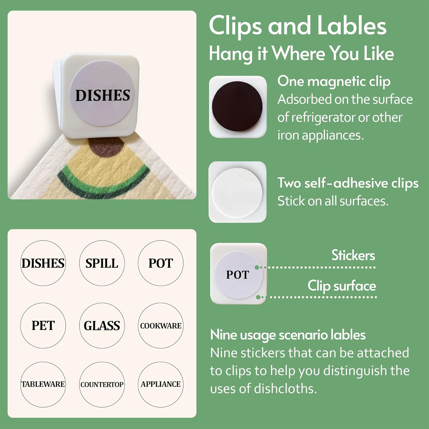• Easy to Clean and Store: Our swedish dishcloths, measuring 7.8 x 6.8 inches, each set comes with 8 cellulose dish cloths in 4 styles, along with 2 self-adhesive clips, 1 magnetic clip, and 9 labeling tags. Customize storage for easy access, hanging them on walls, counters, or refrigerators to keep your kitchen organized