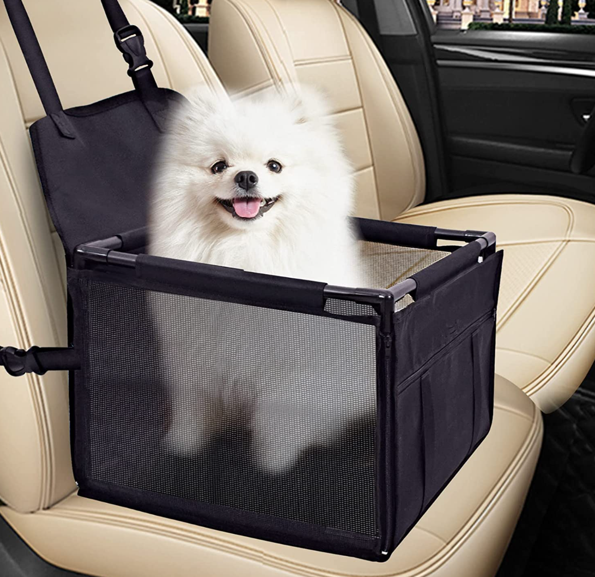 Premium Material & Multiple Ways to Use- pet booster seat for car is made of waterproof good polyester, breathable netting, thick webbing, strong hooks and other small accessories, sturdy and comfortable to use. 4 different ways to use to meet your pet's needs.
