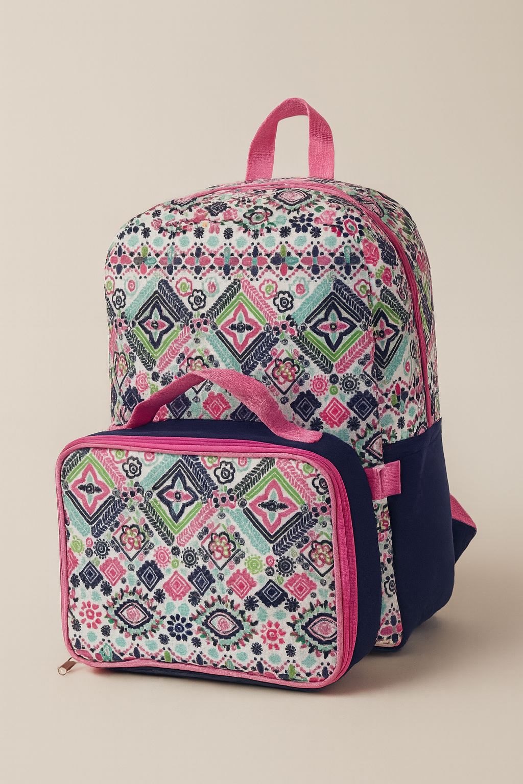 Add a pop of color and culture to your school day with the Tribal Bloom Backpack & Lunchbag Set. Featuring a bold Aztec-inspired print in pink, navy, green, and white, this 16β backpack comes with a matching detachable lunchbag β combining style, practicality, and fun in one must-have school essential.